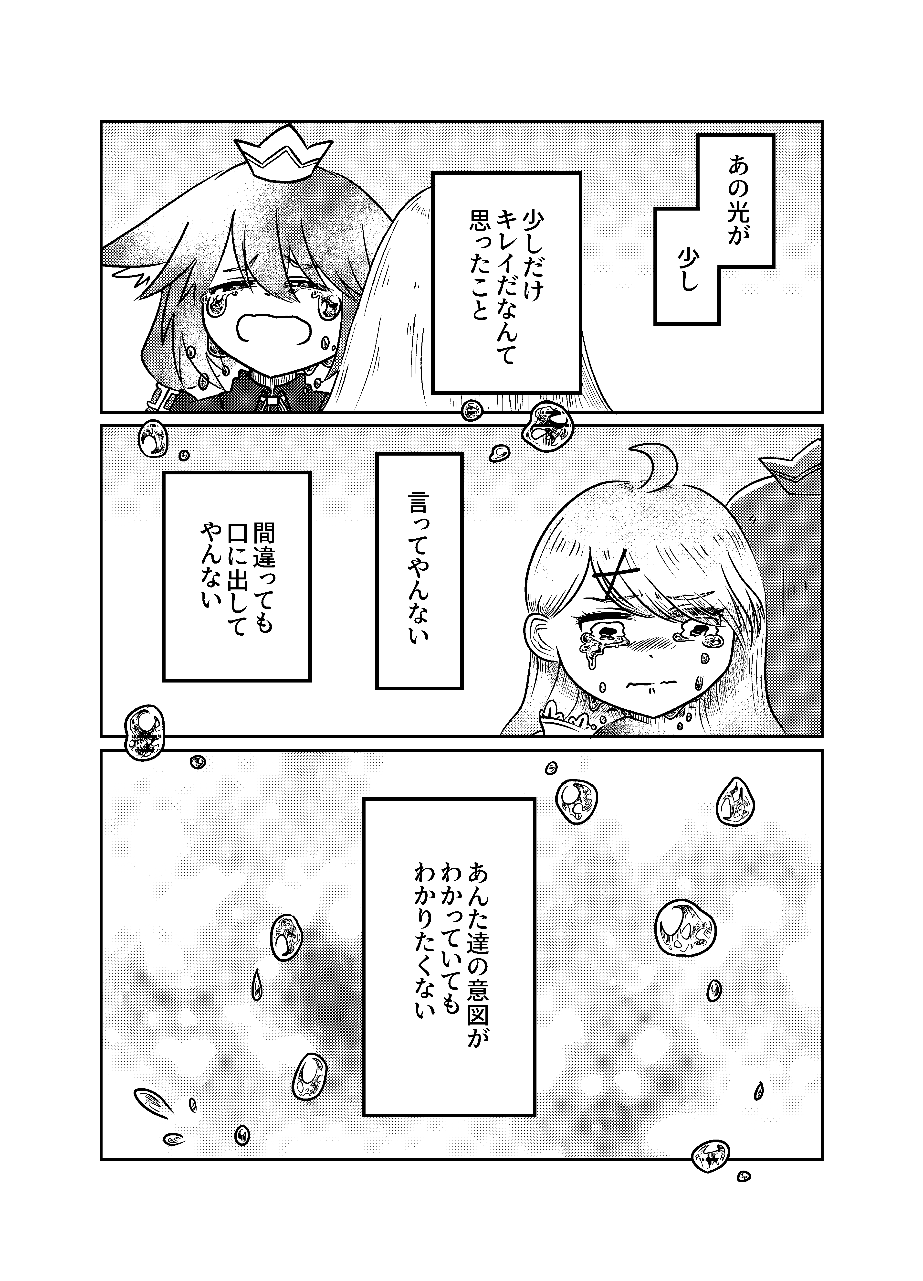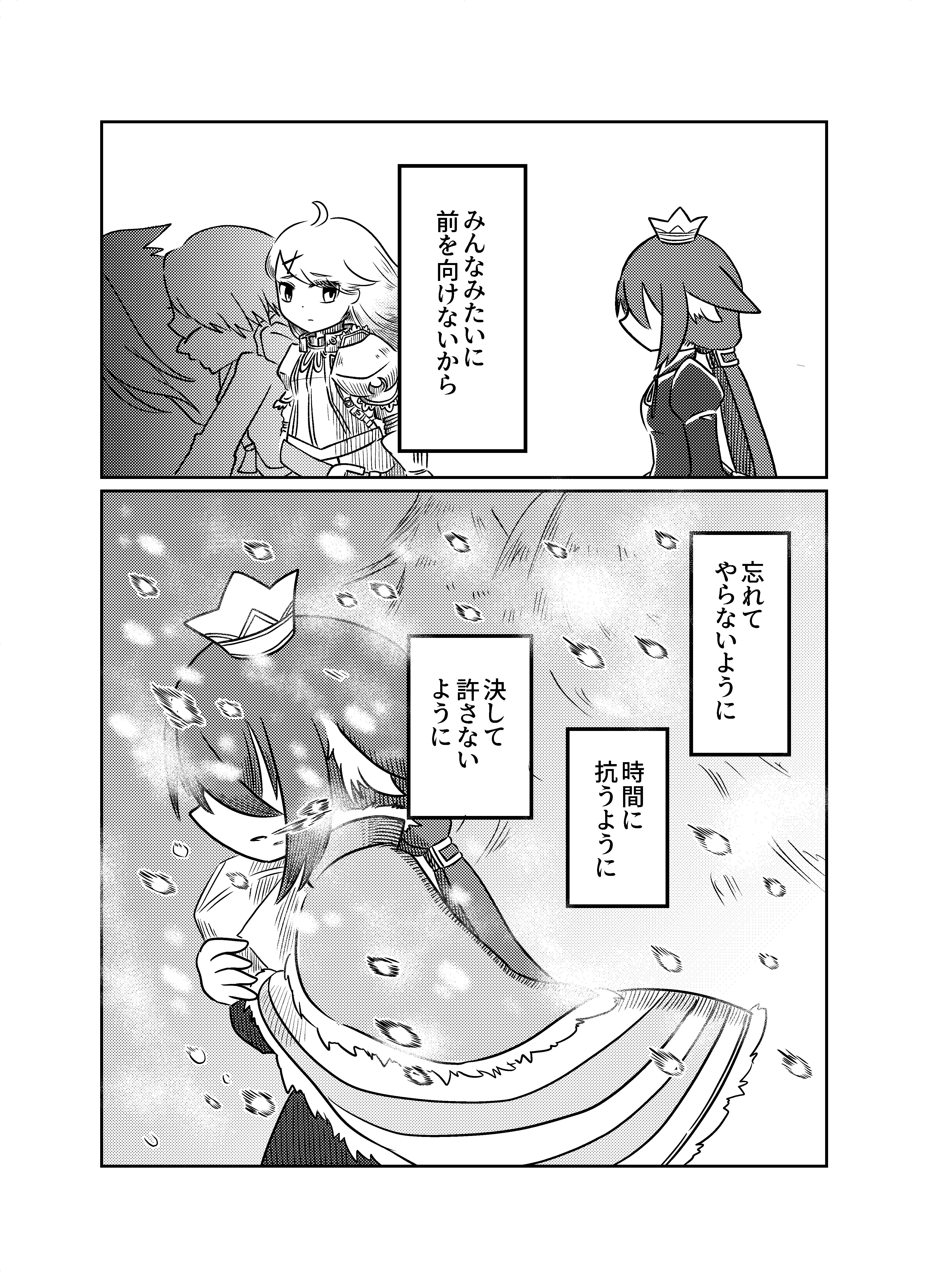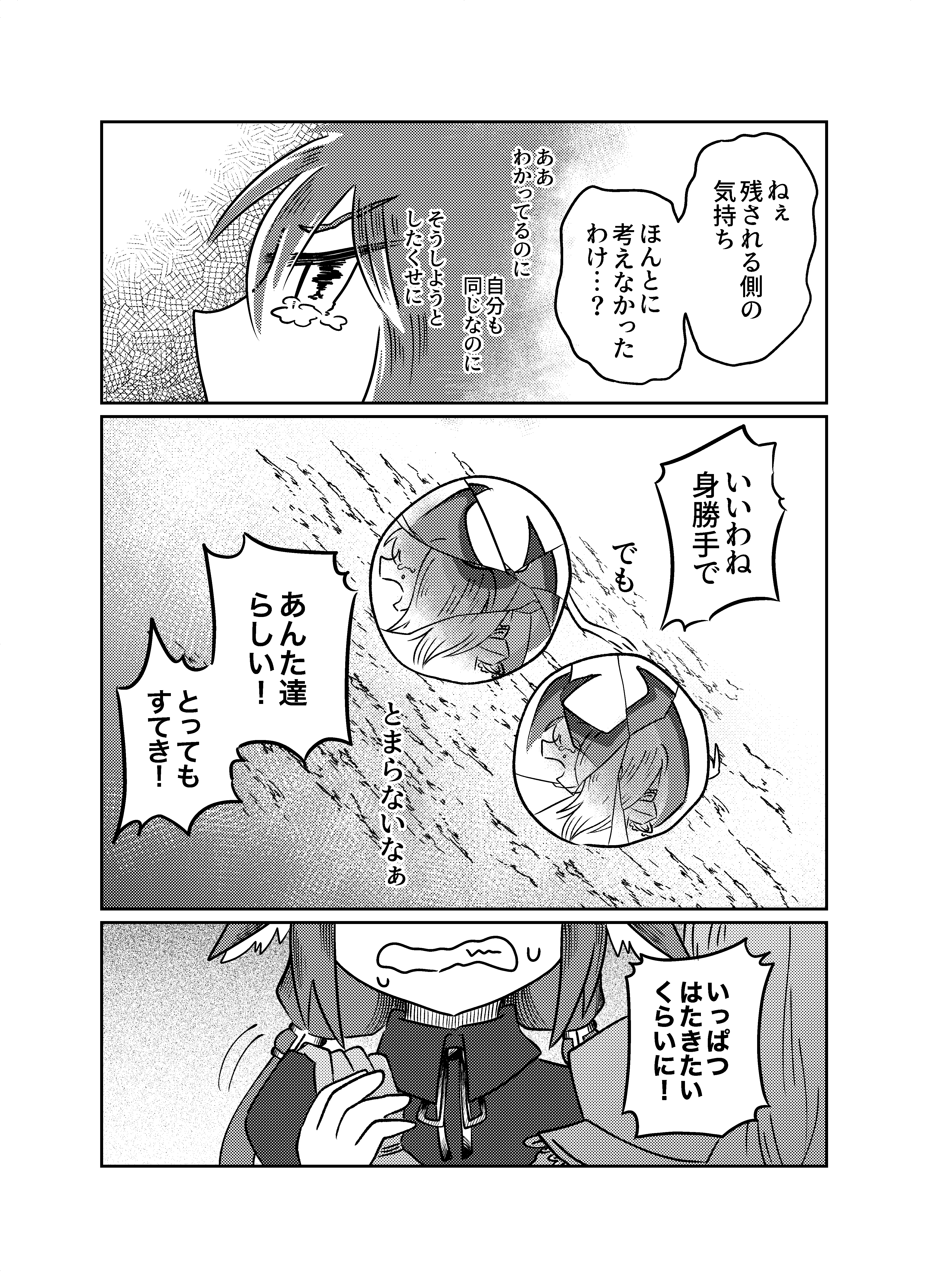 託す側と託される側、アンソロジーに描いたのは明るいさよならで読んでる側が引き止められないし、もう止められないさよならをかけたらいいなと描いていました。2人に未練はもうないし、2人の意思で決めたものなので見送るしかない話。